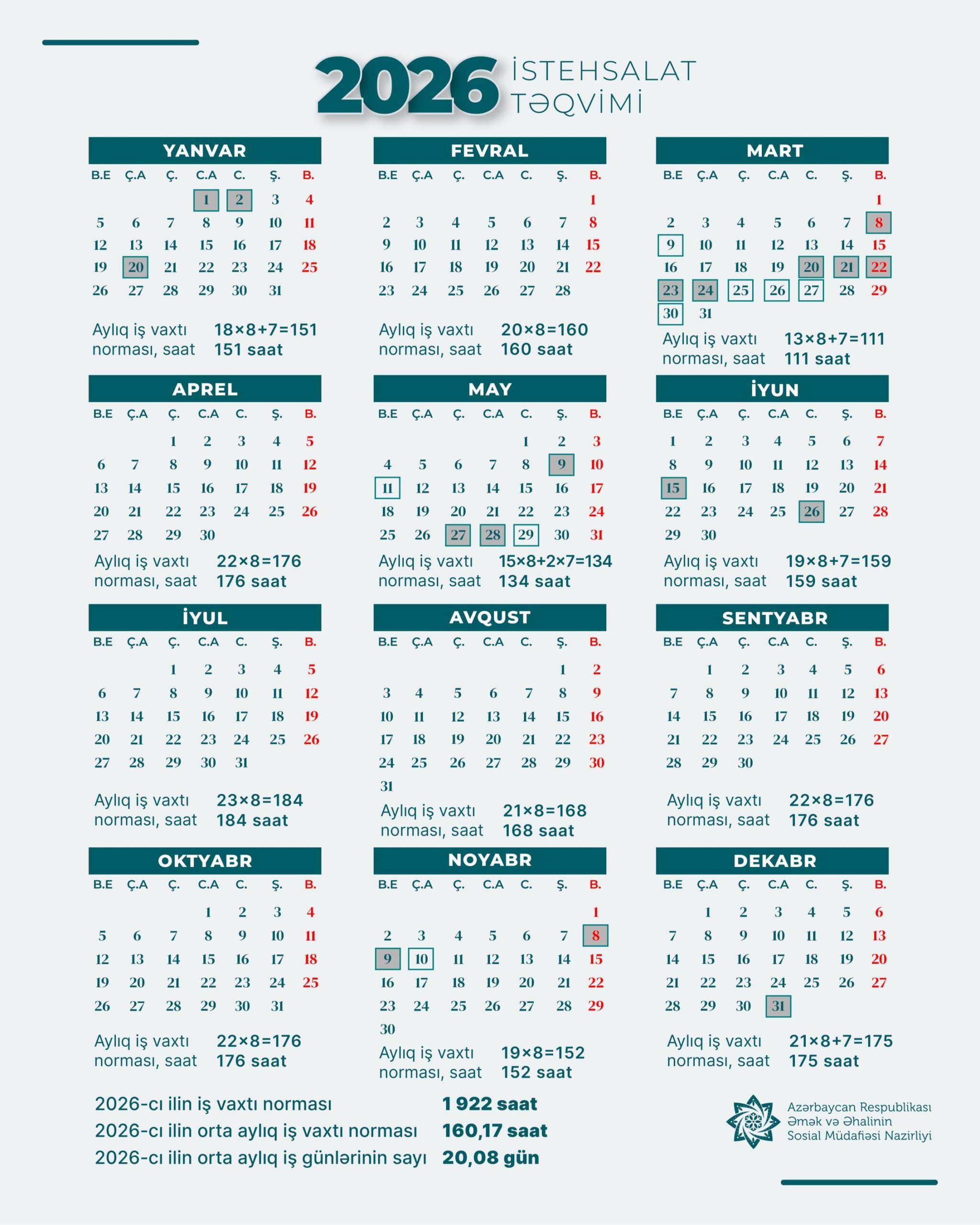 2026-cı ilin iş vaxtı norması 40 saatlıq beşgünlük iş həftəsi üzrə 8 saatlıq iş günü hesabından müəyyən edilir və bu zaman Azərbaycan Respublikası Əmək Məcəlləsinin 108-ci maddəsinin 1-ci hissəsinə müvafiq olaraq iş günü hesab edilməyən bayramqabağı, səsvermə, habelə Ümumxalq hüzn günü qabağı iş günlərində həftəlik iş günlərinin müddəti bir saat qısaldılır.