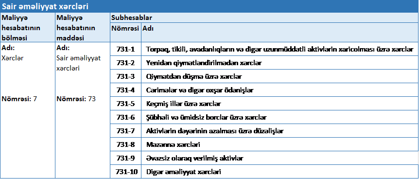Xərc hesabı olan 731 №-li “Sair əməliyyat xərcləri” üzrə aşağıdakı subhesablar açıla bilər (Qaydalar/55.2):