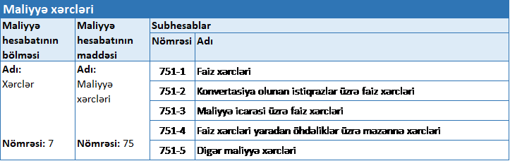 Mühasibat uçotunun hesablar planının 7-ci bölməsi üzrə açılan hesablarda ayrı-ayrı xərc maddələri üzrə mühasibat qeydləri aparılır. Belə hesablardan biri Hesablar Planının 75-ci maddəsi üzrə açılan 751-ci “Maliyyə xərcləri” hesabıdır. Bu bölməyə aid olan digər hesablar aşağıdakılardır: