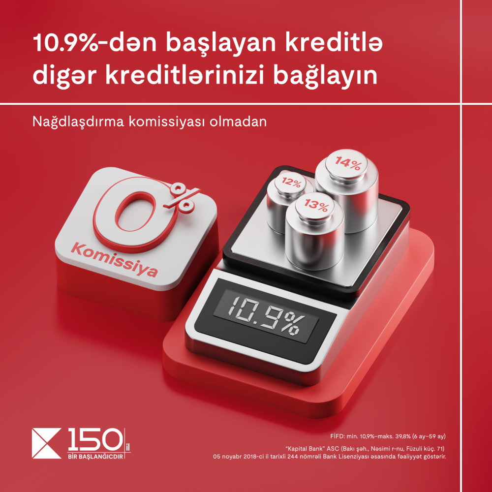 Yüksək faizlərdən, bir neçə yerə kredit ödəməkdən xilas olmaq indi çox asan və rahatdır. Kapital Bank-dan 10.9%-dən başlayan xüsusi şərtlərlə 50 000 AZN-dək nağd kredit əldə edən müştərilər faiz xərclərini aşağı salmaq və aylıq ödənişlərin həcmini azaltmaq fürsətindən yararlana bilərlər.