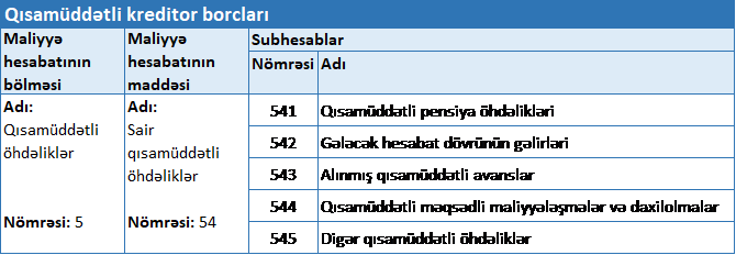 | 3 | Alınmış avansa görə büdcə qarşısında öhdəlik yarandıqda | 545 – Digər qısamüddətli öhdəliklər | 521 – Vergi öhdəlikləri | 10800.00 |