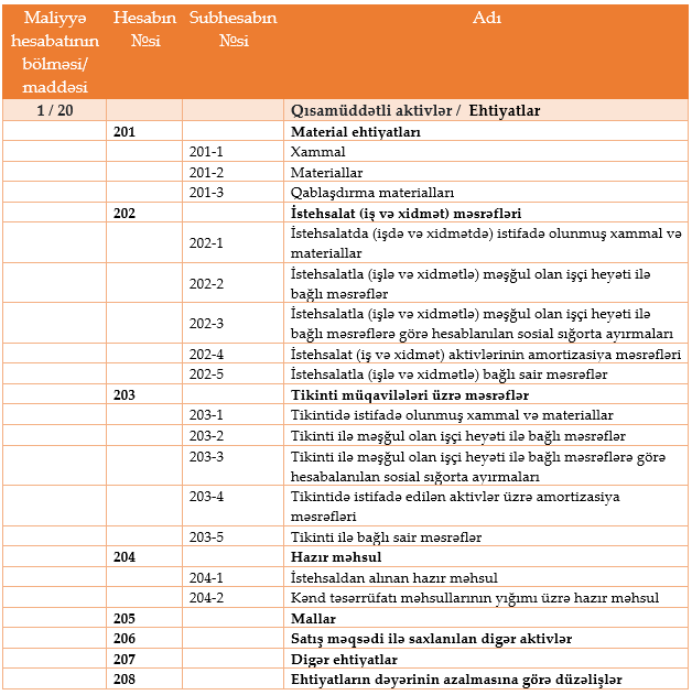 Mühasibatlıqda ehtiyatların daha dəqiq və detallı bölgüsündən istifadə edilir. Mühasibat uçotunun hesablar planına uyğun qruplaşan məlumatlar maliyyə hesabatının 2-ci bölməsinin 20-ci maddəsində, “Ehtiyatlar” adı altında əks etdirilir. Aşağıdakı cədvəldə hesablar planının bir hissəsi verilib. Burada ehtiyatların uçotu üzrə mühasibat hesablarının bölgüsü təsvir olunub.