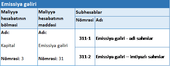 “Emissiya gəliri” adlı 311 saylı hesab kapital hesabıdır. Bu hesabda mühasibat uçotu subyektinin nizamnamə kapitalının yaradılması zamanı səhmlər nominal dəyərlərindən artıq qiymətə satılarsa, səhmlərin satış və nominal dəyərləri arasındakı fərq məbləğinin hərəkəti haqqında ümumiləşdirilmiş məlumatlar əks etdirilir.
