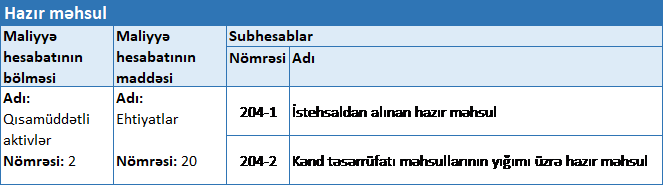 | 11 | Hazır məhsul formalaşdıqda | 204 – Hazır məhsul | 202 – İstehsalat (iş və xidmət) məsrəfləri | 126 700.00 |