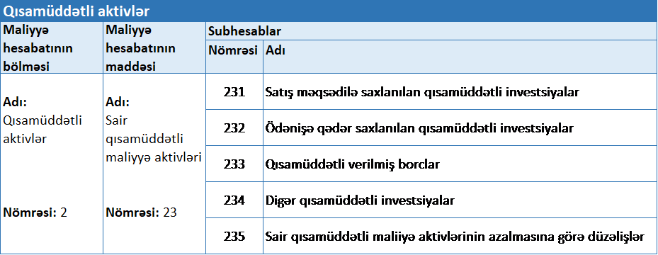 232 saylı aktiv hesabı üzrə uçota alınan ödənişə qədər saxlanılan qısamüddətli investisiyalar Hesablar Planının 23-cü maddəsinin (“Sair qısamüddətli maliyyə aktivləri”) tərkibinə daxildir. Başqa bir şirkətin səhmlərinin alınması alıcı şirkət üçün investisiyadır. İnvestisiyaların alınması üzrə müxabirləşmələrin düzgün aparılması üçün şirkət həmin investisiyalara necə sərəncam verəcəyi müəyyən etməlidir. Birdən çox əməliyyat dövrü üçün saxlanacağı gözlənilən investisiyalar uzunmüddətli investisiya kimi təsnif edilir. Əgər investisiya qısa müddətdə reallaşmaq niyyəti ilə alınırsa, o zaman belə investisiya qısamüddətli investisiyala kimi təsnif edilir.