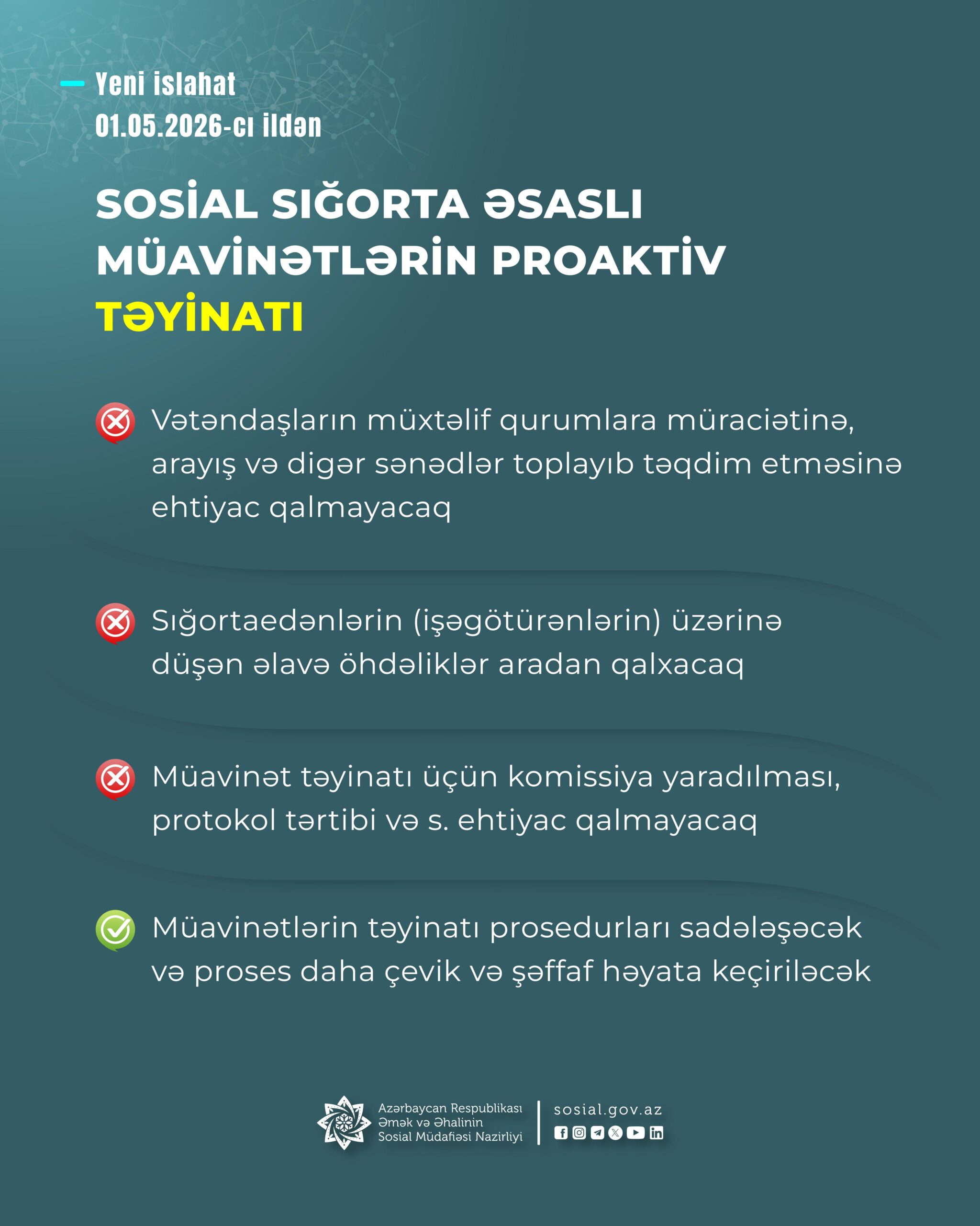 Bununla da həmin müavinətlərin təyinatı üçün işçinin müraciətinə, müxtəlif sənədlər toplayıb təqdim etməsinə ehtiyac qalmayacaq, işəgötürənin bir sıra əlavə öhdəlikləri (komissiya yaradılması, protokol, haqq-hesab cədvəli s. sənədlərin tərtibi, təqdim edilməsi) aradan qalxacaq.