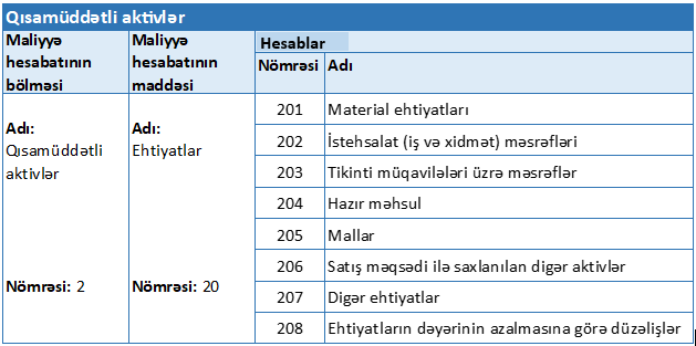 | 1 | Material ehtiyatları alındıqda | 201 – Material ehtiyatları | 531 – Malsatan və podratçılara qısamüddətli kreditor borcları | 130000.00 |