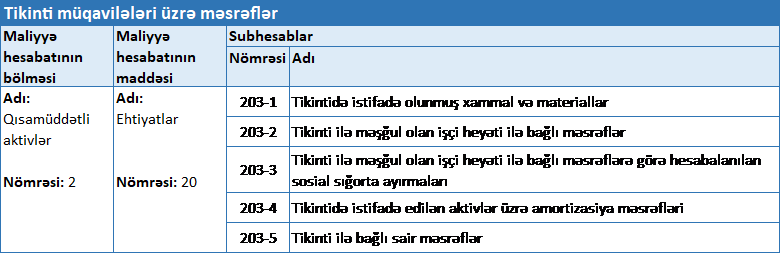 Mühasibat uçotu subyektlərində tikinti müqavilələri üzrə bitməmiş tikinti işlərinin dəyəri 203 saylı “Tikinti müqavilələri üzrə məsrəflər” hesabı üzrə uçota alınır. Bu hesab mühasibat uçotunun hesablar planının “Qısamüddətli aktivlər” bölməsinin 20-ci maddəsinin (“Ehtiyatlar”) tərkibinə daxildir.