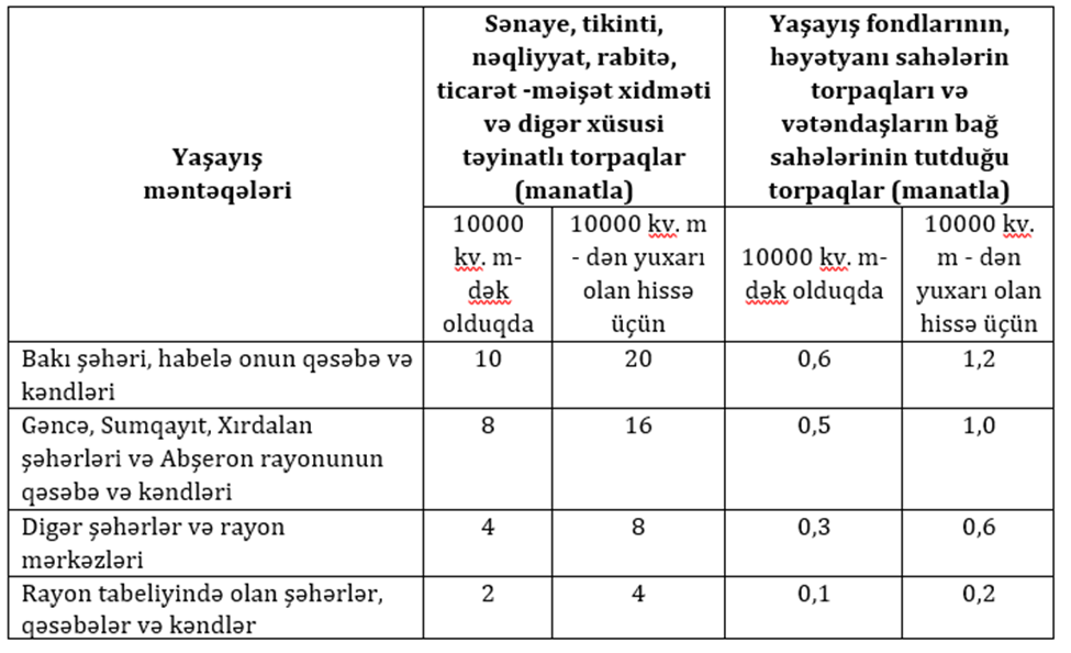 VM-in 206.3 maddəsinə görə, 206.1-ci, 206.1-1-ci maddələrdə qeyd edilən kənd təsərrüfatı torpaqları istisna olmaqla, digər torpaq sahələrinin hər 100 kv.m.-nə görə torpaq vergisinin dərəcələri aşağıdakı cədvəl üzrə müəyyən olunur.
