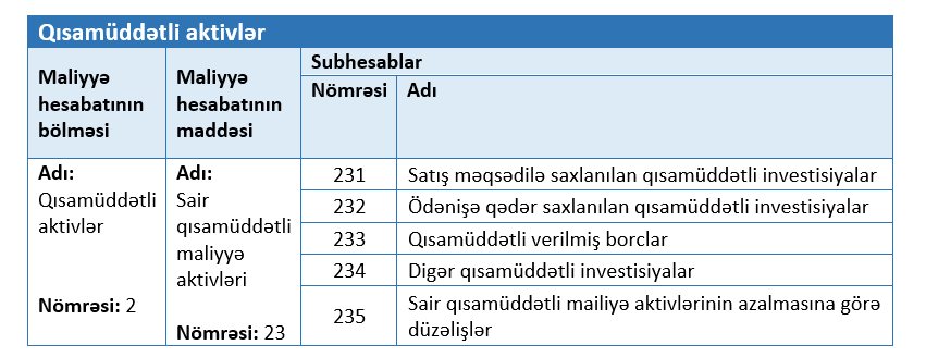 Həmin qaydaların Qaydaların 25.1-ci maddəsinə görə sair qısamüddətli maliyyə aktivləri üçün aşağıdakı hesablar açıla bilər: